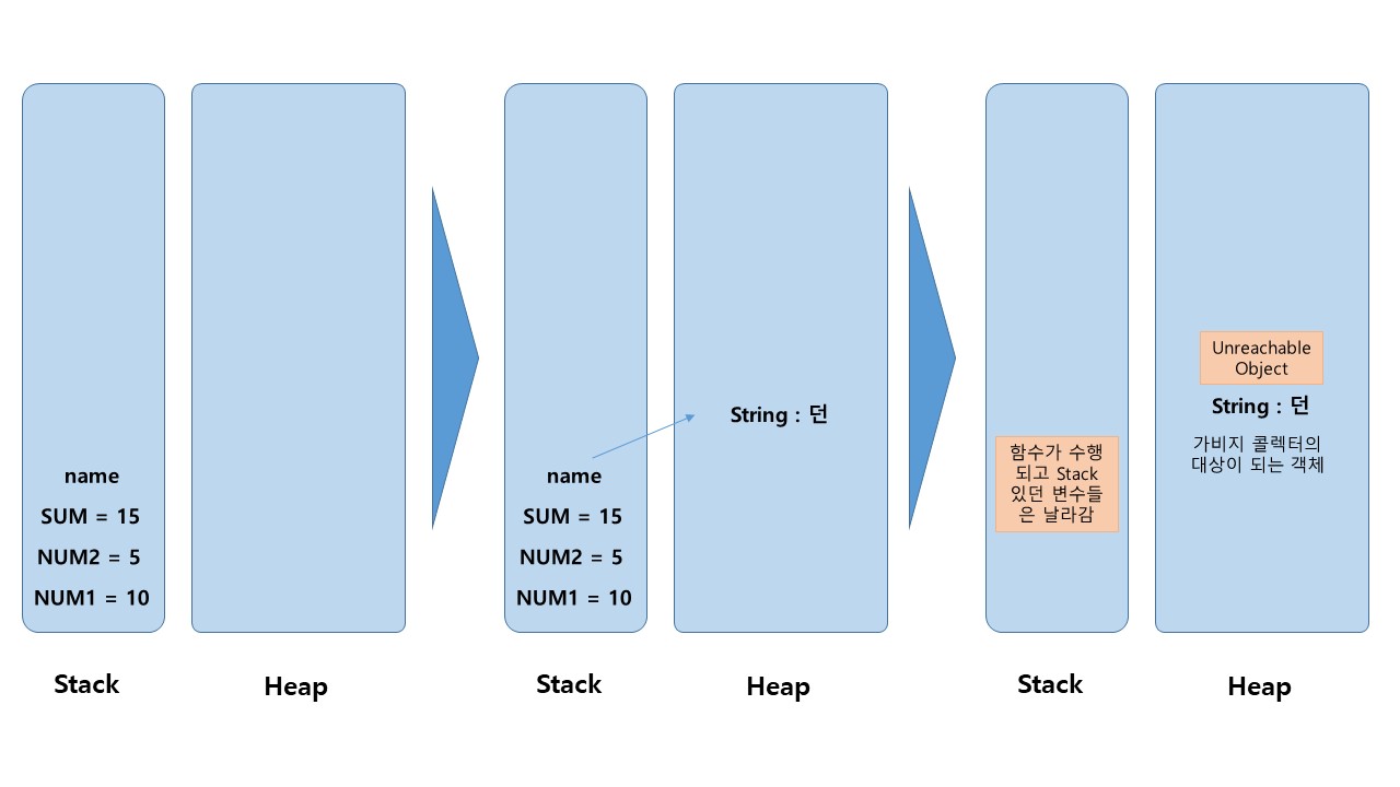 모든 Object 타입의 데이터가 할당. Heap영역의 Object를 가리키는 참조 변수가 Stack에 할당