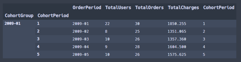 위의 결과를 해석해보자면 2009년 1월에 첫구매한 고객 수가 22명, 주문 횟수가 30번, 총매출 합계가 1850원입니다.