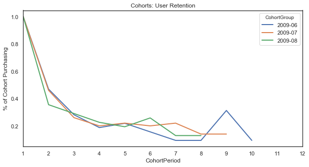 plt.ylabel('% of Cohort Purchasing');