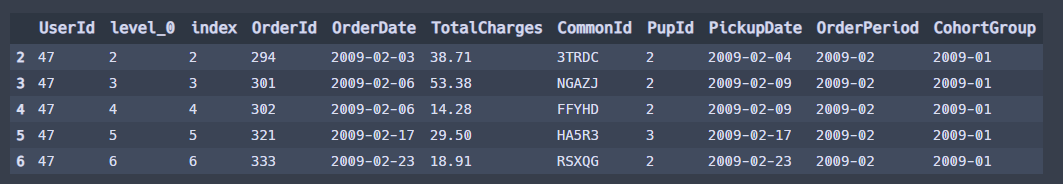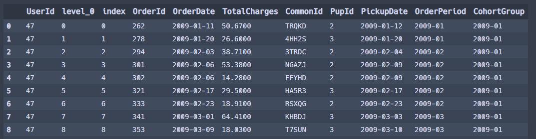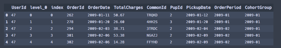 grouped = df.groupby(['CohortGroup', 'OrderPeriod'])