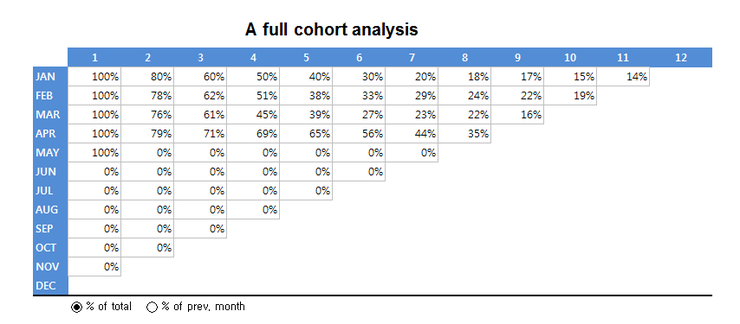 코호트 분석을 검색하면 나오는 대표적인 이미지는 다음과 거의 대부분 비슷합니다.
