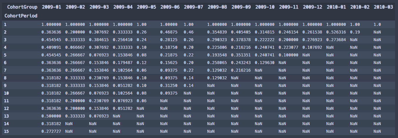 2009년 07월에 유입된 고객들의 패턴을 기준으로 살펴보면 첫 구매 이후 한 달 뒤 46%가 구매행동을 보였고 8개월이 지난 후에는 14%만이 구매행동을 보였습니다. 여기서 자세히 살펴보면 최근 기준으로 구매행동을 보인 고객들의 유입 날짜(년월)를 확인할 수 있습니다.