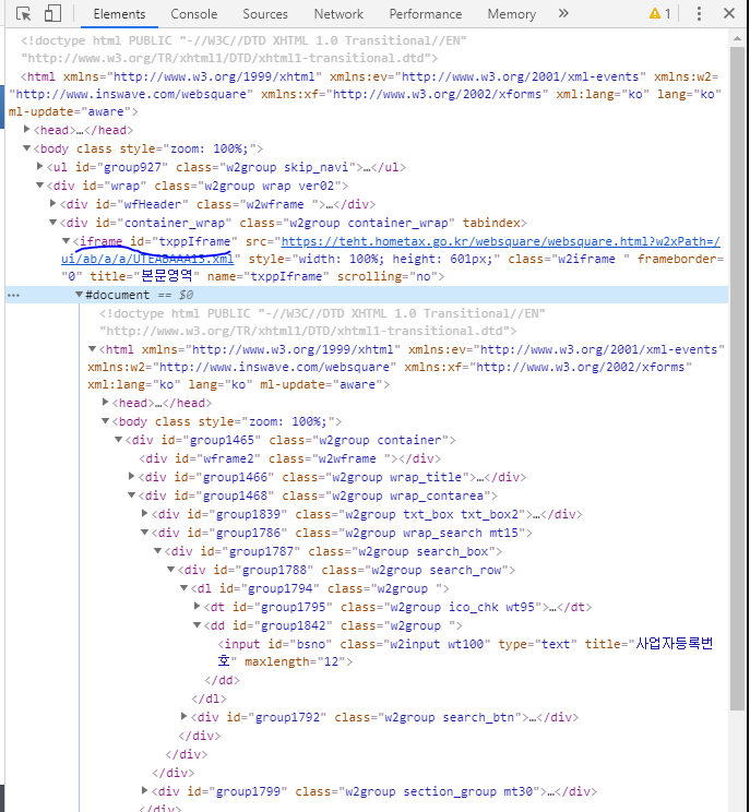 3. 이제 위에서 살펴본 페이지의 html 혹은 xml 구성을 살펴봅니다. 일단 저희가 필요한